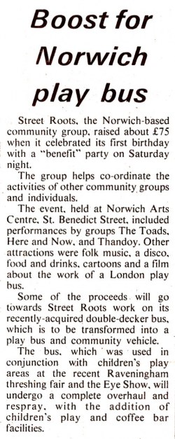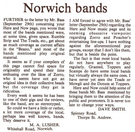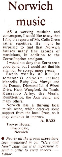 Several letters appeared in the Norwich Eastern Evening News complaining about their lack of coverage of music that their main contributor, Colin Cross, wasn't so keen on! First on the left is from 29th September 1977 and the centre letters appeared on 1st October. On the right is the report about the Street Roots event from the 26th October 1977.